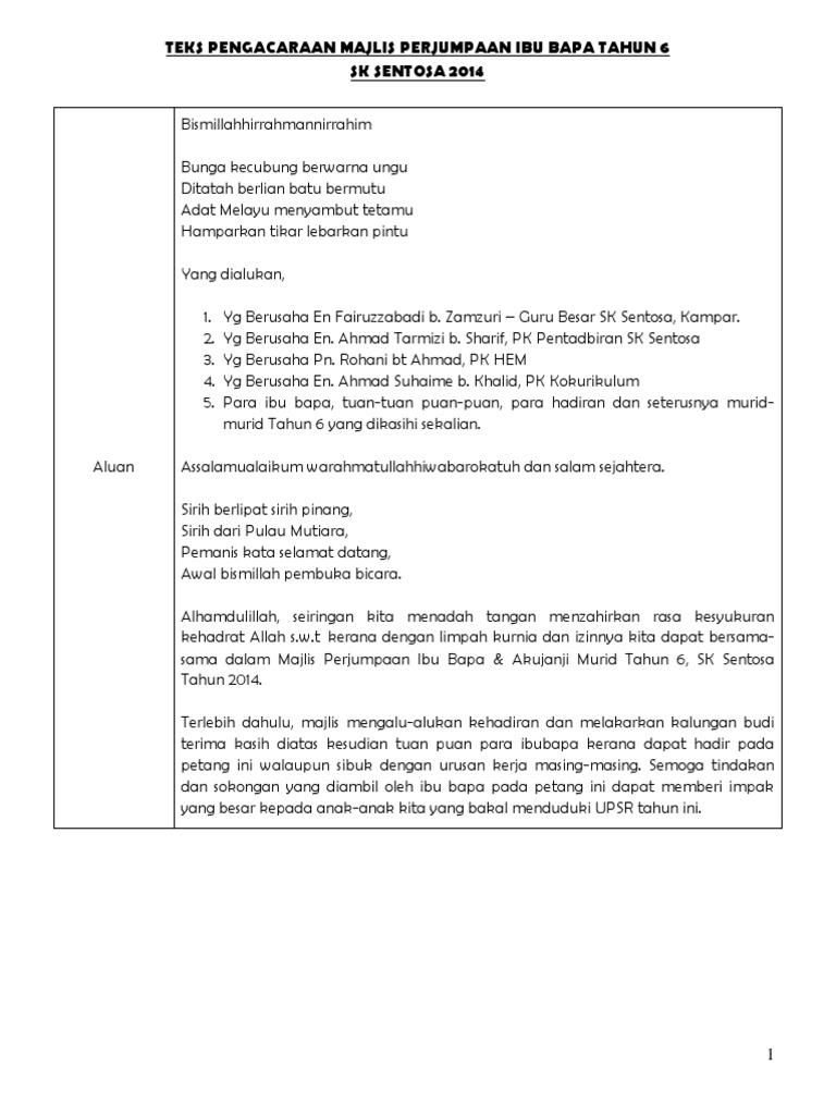 Sewaktu hendak menyiapkan teks pengacara majlis ini, saya cuba juga membuat rujukan dengan mencarinya di internet. Contoh teks pengacara majlis / ucapan emcee majlis persaraan cikgu. Ribuan terima kasih, diucapkan kepada, yang berusaha encik nordin bin rukani, penyelia unit kokurikulum, pejabat pelajaran daerah pasir gudang dan semua ibu bapa kerana sudi meluangkan masa ke majlis kami. Juga sesuai diubahsuai untuk program sambutan lain dan juga peringkat daerah serta. Berikut adalah teks pengacara majlis, mc untuk majlis / program solat hajat perdana peringkat sekolah menengah dan rendah. Teks ceramah adalah teks yang disusun atas beberapa paragraf, yang berisi pemberitahuan ataupun penyampaian informasi di depan khalayak masyarakat luas yang bersifat meyakinkan pembaca dengan tujuan untuk menambah wawasan atau membuat pembaca atau pendengar melakukan sesuatu hal. 0 ratings0% found this document useful (0 votes). Sawah menghijau di tengah bendang, tumbuh dipinggir pohon bidara, pemanis kata selamat datang, awal bismillah tuan, saya ambil skrip pengacaraan yg tuan buat sebagai contoh kpd anak didik saya yg akan menjadi pengacara majlis persaraan cikgu di sekolah. Majlis persaraan pegawai pendidikan merupakan sebahagian tatacara operasi piawai atau s.o.p. $ainudin bin ku#nin pengetua smk damai ja<b>a. Dalam lingkungan masyarakat, ceramah merupakan suatu hal biasa yang sering. Mat nadzari bin ahmad dahlan (ahli dewan undangan negeri batang kali). Yang dipertua persatuan ibu bapa dan guru.